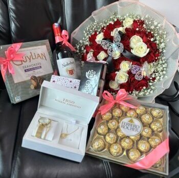 Celebrate love in the most elegant way with our Luxury Love Hamper, featuring a stunning bouquet of red and white roses paired with premium Ferrero Rocher and Guylian chocolates, a fine bottle of red wine, and an exquisite jewelry gift set. Perfect for anniversaries, romantic surprises, Valentine’s Day, or any special moment worth cherishing. Send this unforgettable flower and gift combo in Kenya and make their heart bloom with joy.