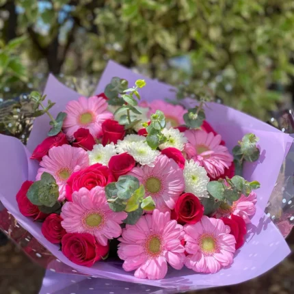 Lily Luxe – Roses, Chrysanthemums & Lilies BouquetExperience pure elegance with Lily Luxe, a luxurious arrangement of fresh roses, vibrant